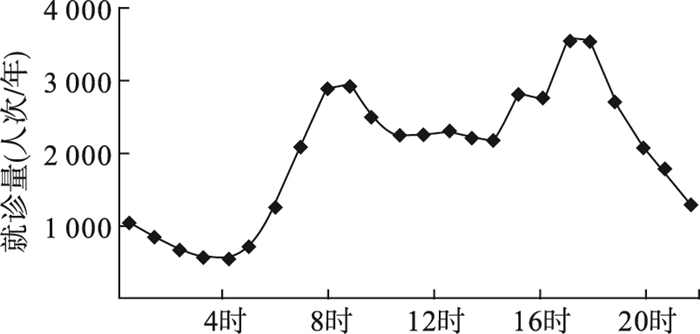结果显示,就诊量存在时段波动,即2个小高峰,第1个就诊小高峰出现在7:00-10:00,第2个就诊高峰出现在16:00-20:00,就诊最低谷为1:00-5:00。每日7:00急诊患者例数开始增加,8:00达到1个小高峰点,11:00左右就诊数量略有下降,16:00左右逐渐增加,18:00达到高峰期最高点,逐渐回落,凌晨3:00就诊患者数量最少。在全天24 h分布中,11:00-15:00为患者就诊数量最为平缓的时间段,16:00-20:00是就诊患者高峰期,占全天就诊患者例数31.9%,凌晨1:00-5:00处于全天就诊患者最少时段。