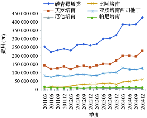 从图1看出,2011—2014年碳青霉烯类抗菌药物DDDs使用趋势表现出季节变化规律,从2012年第2季度开始出现大幅周期性上涨,至2014年第4季度涨幅达到83.79 %,每年的第2和第4季度为用量高峰期。图2所示,151所医院住院患者碳青霉烯类抗菌药物使用金额从2012年第1季度开始大幅增长,并在2012年的第2季度和2014年的第1季度出现2个小高峰,但没有呈现出DDDs变化趋势那样的季节规律。从图3看出,不同种类的碳青霉烯类抗菌药物使用强度总体上都呈上升趋势,但有不同的变化规律。使用强度一直最高的是美罗培南(J01DH02),其在每年的第4季度都会出现1个强度高峰。位于使用强度第2位的是亚胺培南/西司他丁(J01DH51),其没有明显的变化趋势,变化幅度也不是特别大。涨幅比较大的是厄他培南(J01DH03)、比阿培南(J01DH05)和帕尼培南(J01DH55)。其中比阿培南在2012和2013年的第2季度使用强度较强。由图4可见,限定日费用较高的碳青霉烯类抗菌药物是比阿培南(J01DH05),其次是帕尼培南(J01DH55),第3和第4位分别是美罗培南(J01DH02)和亚胺培南/西司他丁(J01DH51),最少的是厄他培南(J01DH03)。