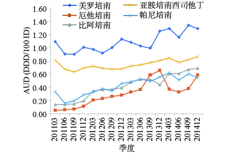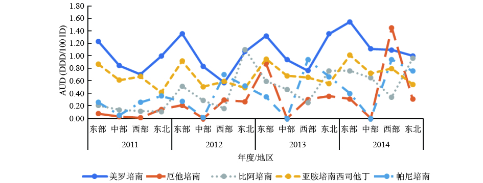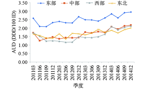 图 6 不同地区碳青霉烯类抗菌药物AUD季度变化情况 |