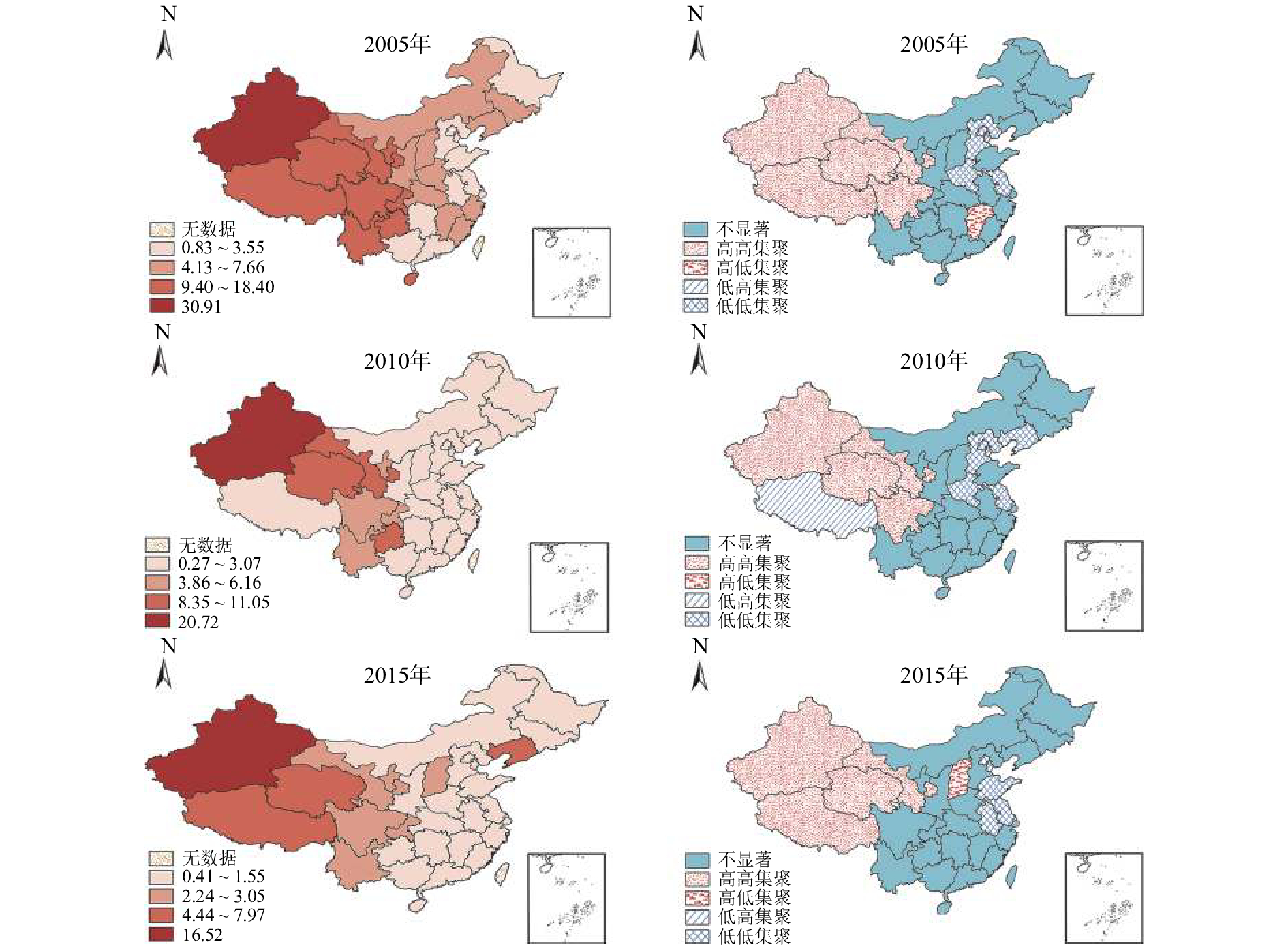 为其均值;n为地区数量;Wij是代表空间地理位置的n × n空间权重矩阵。如果地区i和地区j相邻,则矩阵中对应的Xij为1,否则为0。在实际计算时使用的空间权重矩阵需进行标准化。(2)局部空间自相关分析:局部空间自相关分析使用局部Moran′s I值探索集聚区域[9]。局部Moran′s I值的计算公式如下[8]:局部