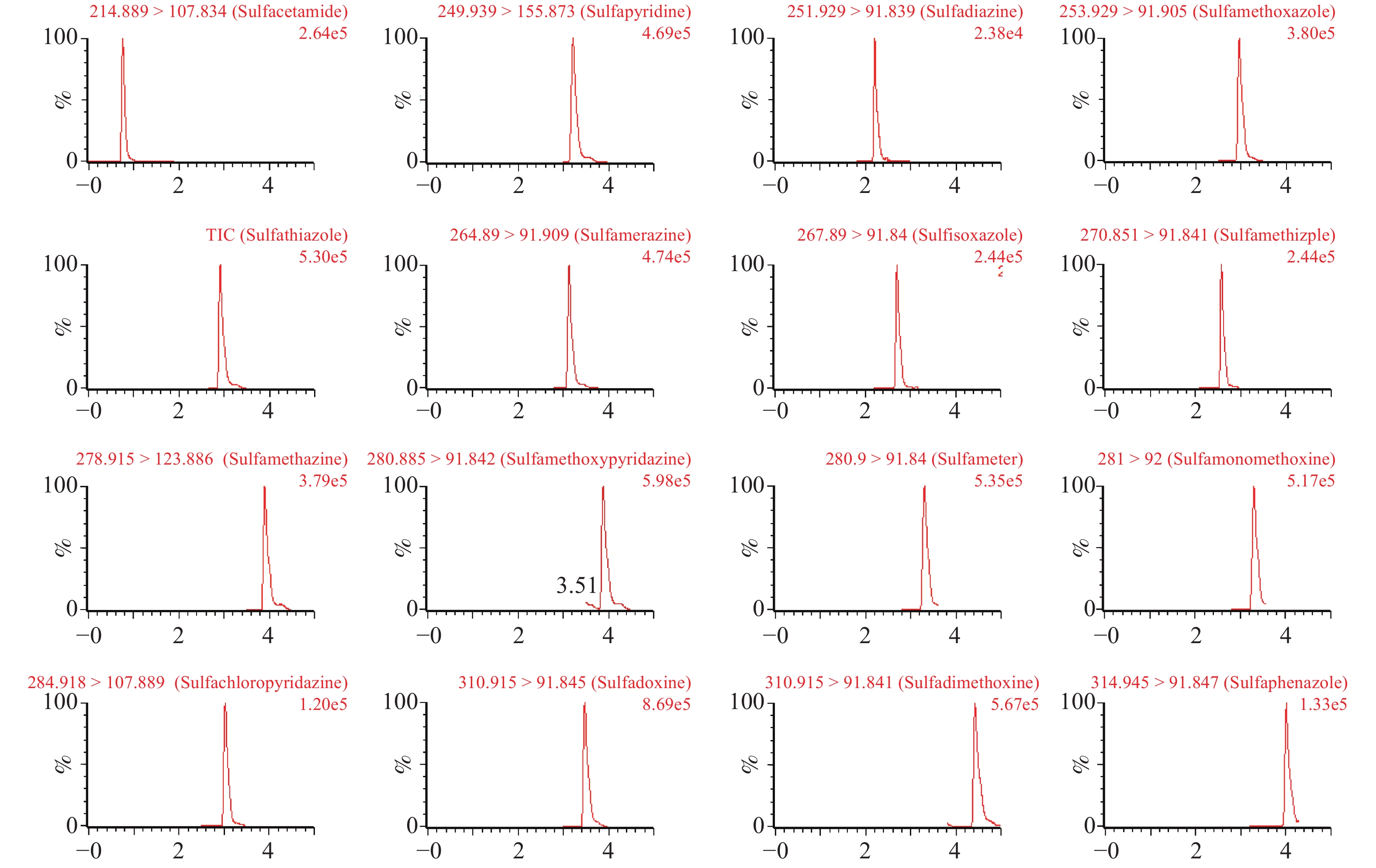 图 1 加标浓度为100 ng/mL的16种磺胺类抗菌药物的MRM色谱图 |