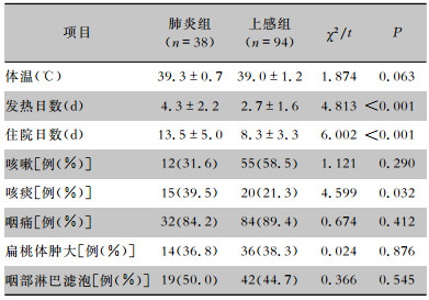 2 结果 2.1 患者临床特征肺炎组38例患者均为男性,平均年龄(20.66±2.17)岁;上感组患者中,92例男性,2例女性,平均年龄(20.49±2.20)岁,两组患者性别、年龄比较,差异均无统计学意义(均P>0.05)。与上感组比较,肺炎组患者咳痰比例更高,发热日数和住院时间更长(均P<0.05),其余各组差异无统计学意义(均P>0.05)。见表 1。