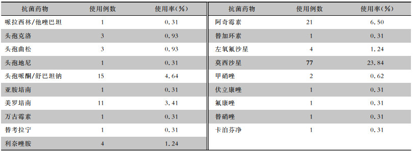 323例COVID-19患者抗菌药物使用率为33.44%(108例),其中预防性抗菌药物使用率为82.41%;抗菌药物以单一用药(84.26%)以及口服给药方式为主(68.52%)。抗菌药物累计使用日数为1~29 d,平均累计使用日数为(7.61±5.65)d。使用率最高的抗菌药物为莫西沙星(23.84%),其次为阿奇霉素(6.50%)和头孢哌酮/舒巴坦钠(4.64%)。轻型、普通型、重型、危重型COVID-19患者抗菌药物使用率分别为33.33%、26.67%、68.42%、88.89%。抗菌药物使用率较高的病区为一病区(75.86%)、二病区(73.33%)。见表 5~7。