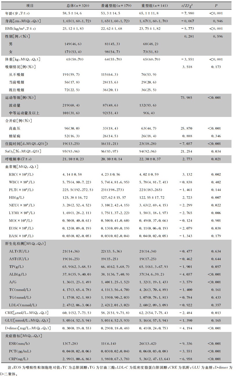 2 结果 2.1 基线临床特征本研究共纳入320例患者,普通型组179例(55.9%),重型组141例(44.1%)。普通型组男性81例(45.3%),女性98例(54.7%);重型组男性68例(48.2%),女性73例(51.8%),两组患者性别比较,差异无统计学意义(P>0.05)。重型组患者年龄、BMI高于普通型组(均P < 0.001)。普通型组患者中等运动量及以上等级的比例高于重型组患者(P < 0.001)。普通型组中合并高血压患者的比率低于重型组(18.4% VS 44.7%,P < 0.001);两组患者吸烟、合并糖尿病情况比较,差异无统计学意义(均P>0.05)。普通型组患者中位住院日数短于重型患者(P < 0.001)。普通型组患者红细胞计数(RBC)、血红蛋白(HB)、淋巴细胞绝对值(LMY)较重型组患者高,中性粒细胞绝对值(NEU)较重型组偏低(均P < 0.05);血白细胞计数(WBC)、血小板计数(PLT)、单核细胞绝对值(MO)、嗜碱性粒细胞绝对值(BAS)两组比较,差异均无统计学意义(均P < 0.05)。肝生化检查中,普通型组患者清蛋白(ALB)、清蛋白/球蛋白比值(A/G)高于重型组患者(P < 0.001);丙氨酸氨基转移酶(ALT)、天门冬氨酸氨基转移酶(AST)、总蛋白(TP)两组患者比较,差异均无统计学意义(均P>0.05)。重型组患者降钙素原(PCT)、C反应蛋白(CRP)、血沉(ESR)三项炎症指标均高于普通型组患者(均P < 0.001)。见表 1。