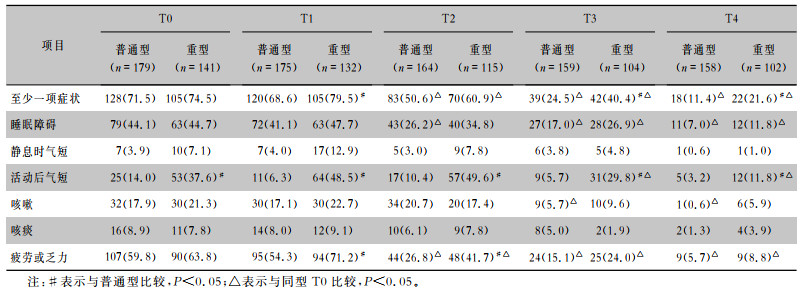 纳入患者流程图见图 1。在出院6、18、24个月时,普通型组患者存在至少1项持续症状的患者比例均比重型组低(均P<0.05);疲劳或乏力为主要临床症状,在出院6、12个月时,普通型组患者疲劳或乏力的比例均低于重型组患者(均P<0.05)。两组患者存在至少1项持续症状的比例在出院后12个月下降;普通型组患者中疲劳或乏力症状、睡眠障碍于出院后12个月好转(均P < 0.05),咳嗽患者的比例于出院后18个月下降(P < 0.05);重型组患者疲劳或乏力比例于出院后12个月下降(P < 0.05),睡眠障碍及活动后气短患者的比例于出院后18个月下降(均P < 0.05)。见表 2。
