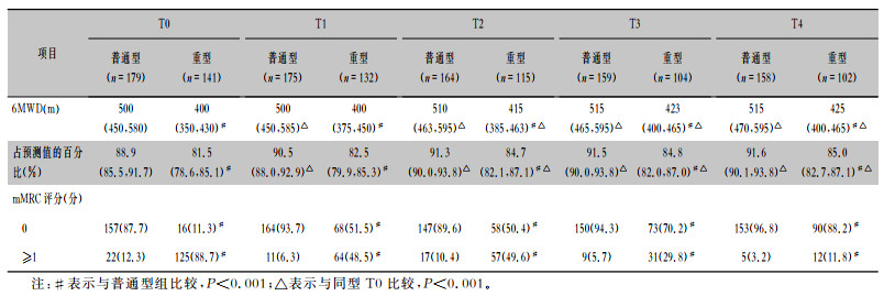 在5个时间点普通型组患者6 min步行距离及其占预测值的百分比均高于重型组(均P < 0.001)。将5个时间点的6MWD两两比较,所有患者出院后12个月较出院时提高(均P < 0.001)。6MWD占预测值的百分比,出院后6个月较出院时提高(P=0.007),出院后24个月较出院后6个月提高(P < 0.001)。普通型患者6MWD及其占预测值的百分比,在出院后6个月较基线提高(均P < 0.001);重型患者6MWD及其占预测值的百分比,在出院后12个月较基线提高(均P < 0.001)。见表 3、图 3。