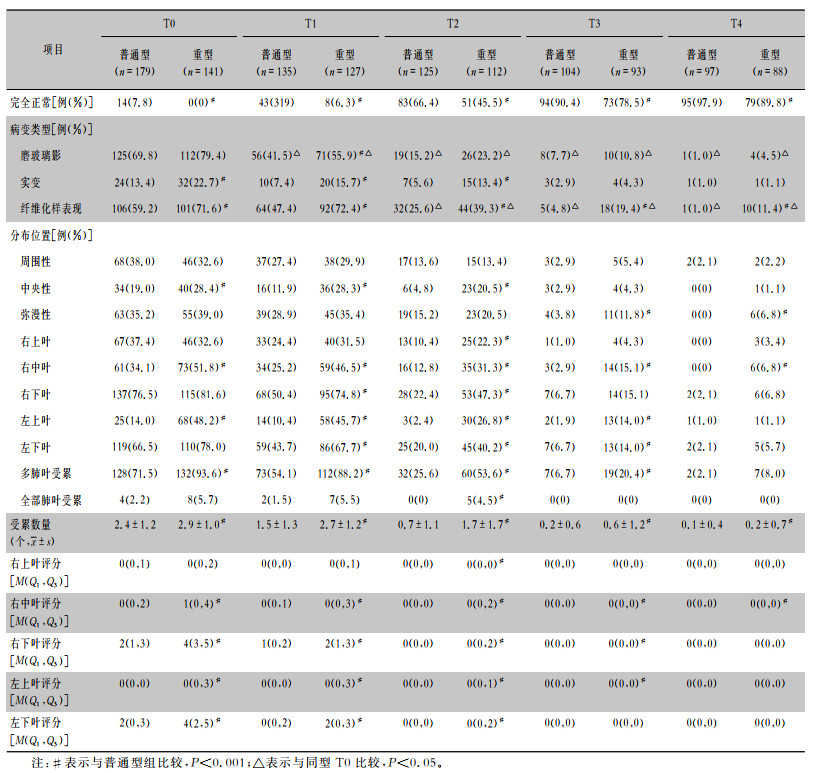 基线(T0)、第一次随访(T1)、第二次随访(T2)、第三次随访(T3)、第四次随访(T4)的结果表明,普通型组患者胸部CT完全正常的比例均高于重型组(均P < 0.05),见表 4,图 4(A)。普通型组及重型组患者5个不同时间点,胸部CT完全正常的比例比较,差异均有统计学意义(均P < 0.001)。在出院时,胸部CT最常见的改变为磨玻璃影(237/320,74.1%)及纤维化样改变(207/320,64.7%)。普通型组及重型组患者,磨玻璃影在出院后6个月时较出院时明显吸收,纤维化样改变均在出院后12个月较出院时明显吸收(均P < 0.05);在随访5个时间点,重型组患者胸部CT累积肺叶个数及胸部CT半定量评分均高于普通型组(均P < 0.001)。见图 4(B、C)。