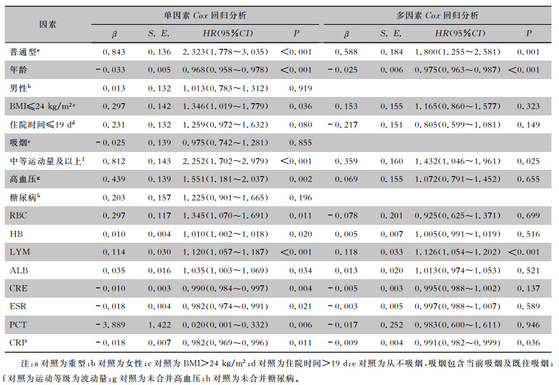 | 表 5 胸部CT异常表现完全吸收的单因素及多因素Cox回归分析 Table 5 Univariate and multivariate Cox regression analysis on complete absorption of abnormal chest CT findings |
