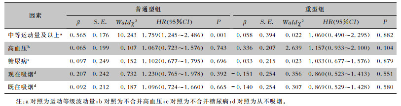 对两组患者按运动等级、高血压、糖尿病及吸烟状态进行组内分层分析,以胸部CT完全吸收为因变量,进行Cox回归分析,结果显示:普通型组中,按运动等级分层(中等运动量及以上/波动量)(HR=1.759,95%CI:1.245~ 2.486,P=0.001),表明运动等级越高是普通型组患者胸部CT完全吸收的独立保护因素。重型组分层,差异均无统计学意义(均P>0.05)。见表 6。