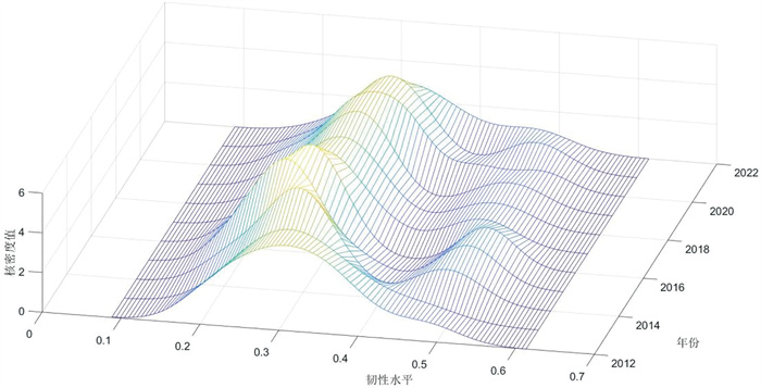 三、实证结果分析 (一) 青岛市旅游经济韧性时空演化 1、青岛市旅游经济韧性时序演变趋势借助三维核密度估计方法,对青岛市2012—2022年旅游经济韧性的演化轨迹进行描绘,清晰揭示其时序演进特征(图 1)。