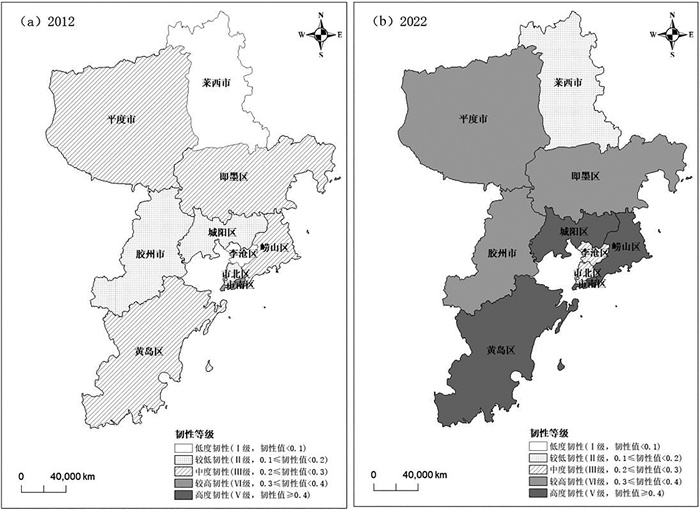 图 2 青岛市旅游经济韧性空间格局演化(2012年、2022年) 注: 该图基于自然资源部标准地图服务网站下载的审图号为GS(2019)1822号的标准地图制作,底图无修改。 |