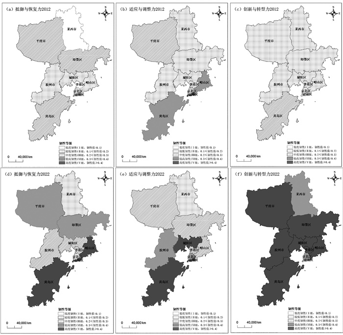 2、青岛市旅游经济韧性空间分异特征为刻画2012—2022年青岛市旅游经济韧性的整体空间演化特征和不同评价维度的演变特征,选取研究期首尾年份(2012年、2022年),运用ArcGIS绘制青岛市旅游经济韧性空间格局演化图(图 2)和各维度空间格局演化图(图 3),依据自然断裂法将旅游经济韧性划分为五个等级:Ⅰ级为低度韧性(0, 0.1)、Ⅱ级为较低韧性[0.1, 0.2)、Ⅲ级为中度韧性[0.2, 0.3)、Ⅵ级为较高韧性[0.3, 0.4)、Ⅴ级为高度韧性[0.4, 1.0)。
