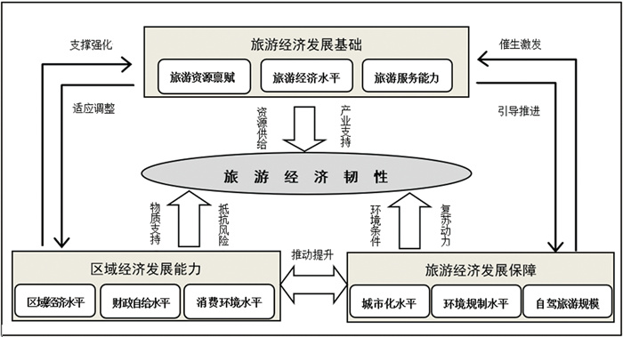 1、旅游经济韧性影响机理模型构建旅游经济韧性的生成与演化不仅受旅游系统内部资源配置与要素耦合的影响,也深层嵌入区域经济、治理能力与制度保障等外部环境之中。基于此,本研究构建旅游经济韧性影响机理模型(图 4),系统识别“旅游经济发展基础—区域经济发展能力—旅游经济发展保障”三大支撑系统,揭示旅游经济韧性的生成逻辑与演化路径。