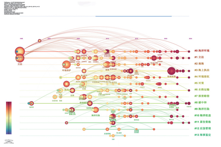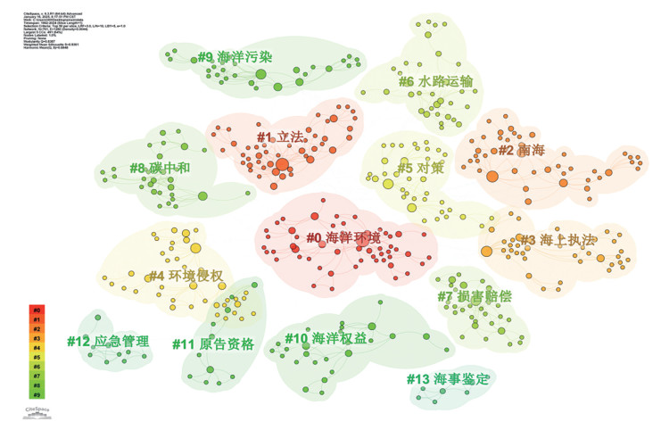 在聚类分析的基础上,汇总各聚类编号及其所对应的关键词,形成统计表(表 3)。其中,聚类号越小,聚类的体积越大。此外,每个聚类的轮廓值均大于0.7,表明聚类效果良好。通过表 3可以看出,中国海洋环境保护法的研究热点主要集中在三个方面,即海洋环境保护具体制度研究(“#0海洋环境”“#1立法”“#5对策”“#10海洋权益”)、海洋环境污染损害赔偿研究(“#4环境侵权”“#7损害赔偿”“#11原告资格”)、海洋环境污染行政执法与刑事规制研究(“#2南海”“#3海上执法”“#6水路运输”“#8碳中和”“#9海洋污染”“#12应急管理”“#13海事鉴定”)。