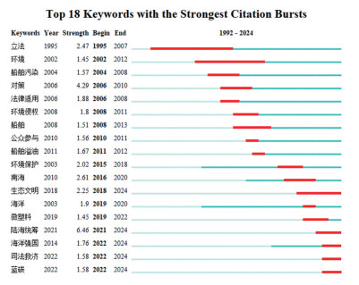 关键词突现图谱能够反映特定时期某研究领域对某个主题的关注程度及其变化情况,对关键词突现图谱进行研究可以揭示该研究领域的演进路径和前沿问题。本研究利用CiteSpace软件处理样本文献,将节点类型设置为关键词(Keywords),选择突现(Burstness),将最小持续时长设置为2,将γ值设置为0.4,得到关键词突现图谱(图 5)。关键词突现图谱中的关键词突现度(Strength)表示阶段时间内研究热点的活跃程度,突现时间段中的开始(Begin)和结束(End)年份是指节点引用量出现较大转折的时间点,表明研究出现新的趋势。[28]由图 5可知,关键词突现的时段并非独立的,在时间上存在交叉重叠,在内容上各阶段相互衔接,承上启下。根据突现关键词的出现时间,可以将1992-2024年中国海洋环境保护法研究大致划分为三个阶段:初步探索阶段、稳步发展阶段和深化推进阶段。每个阶段所关注的核心主题存在一定的差异,同时也反映了中国海洋环境保护法研究的演进路径和前沿问题。