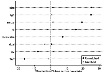 根据表 5结果,控制组和对照组企业的特征变量在匹配后的t值都不存在显著差异,而且匹配后各协变量标准化变差的绝对值均小于5%,通过平衡性检验。因此,本研究选取的匹配方式和匹配原则合理。此外,从图 1可以看出,匹配前处理组和对照组的偏差较大,公司规模、公司年龄的偏差甚至达到20%以上。经过PSM匹配后,各协变量处理组和对照组的偏差都在10%以下,匹配前后控制组和处理组的偏差均显著降低,匹配质量较好。