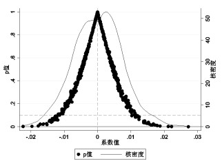 (五) 稳健性检验 1、安慰剂检验本研究将样本中随机抽取的部分企业作为处理组,并为其随机赋予一个政策的执行时间,然后将这些随机处理后的样本按照双向固定回归模型进行回归,在此基础上重复500次,[37]消除可能存在的未知因素对试点企业的潜在影响得出图 4和图 5。图 4和图 5的结果均显示,安慰剂检验的估计系数主要聚集在0的周围,而且这些数据的p值大部分在0.1的阈值之上,同预期的安慰剂检验结果相符,说明供应链韧性的提升确实是由碳排放权交易政策带来的,排除其可能存在的随机相关性。本研究基准回归的结论准确可靠。