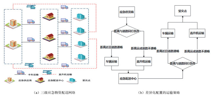 二、人道主义导向下洪涝应急物资陆空协同调度方案 (一) 人道主义导向的洪涝应急物资配送问题与分析洪涝灾害发生后,不同区域受灾程度差异显著、灾情紧急,救援行动面临资源有限与需求迫切之间的突出矛盾。为提升应急物资配送的时效性与公平性,本研究将受灾区域划分为若干受灾点,构建涵盖应急供应商、配送中心与受灾点的三级协同配送网络,强化多层级响应能力。灾后初期,物资需求紧迫且总量巨大,需迅速从备选配送中心及应急供应商向受灾点配送物资。运输策略依据距离与道路通行条件进行差异化配置:临近灾区的配送中心主要依托普通车辆实施公路运输,保障基础供给;远距离应急供应商则采用“车辆—直升机”协同模式,兼顾运输效率与覆盖广度;而对于因洪水淹没、淤泥堆积导致道路完全中断的极端区域,采用直升机空运确保关键医疗、食品与生活物资直达受灾最严重地区,最大限度降低人员伤亡。三级应急物资配送网络及差异化配置的运输策略的具体流程如图 1(a)和图 1(b)所示。