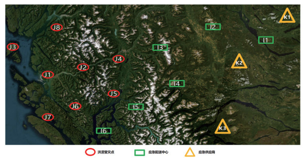 假设某沿海地区遭遇持续强降雨,引发了严重的洪涝灾害。此次灾害波及范围广泛,居民区大面积淹没,基础设施损毁,各乡镇受灾程度不一,造成重大人员伤亡和财产损失。在此背景下,大规模人员转移与安置迫在眉睫,急需快速投送大量应急物资。如图 2所示,在洪涝灾害应急响应情境中,设定洪涝受灾点集合J1—J8,其中受灾点J3位于临海岛屿。这些受灾乡镇多位于地势复杂且道路易受阻的地带。在强降雨影响下,短时高强度降水极易引发洪水漫溢,从而导致严重灾情。假设应急供应商集合为K1—K3市,应急配送中心集合为I1—I6县。当洪涝灾害发生时,应急供应商K1—K3市应快速响应,为应急配送中心集合I1—I6县提供充足物资,以保障受灾点J1—J8的救援物资需求。