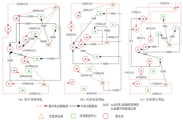 本研究基于Python 3.7平台,调用Gurobi优化求解器对所构建的陆空协同应急物资调配模型进行精确求解。在目标函数中,基于灾后救援优先级与人道主义原则,分别设置医疗急救类、应急食品类与生活救生类三类物资的权重系数为β1=0.5、β2=0.3和β3=0.2。其中,医疗急救类物资权重最高,凸显对受灾群众生命安全的优先保障;应急食品类次之,满足受灾群众的基本生存需求;生活救生类物资权重则兼顾长期安置与心理安抚功能,体现对受灾群体基本权益保障与人文关怀的综合考量。最终得到的最优目标值1.73×108,综合反映了在灾情约束下资源分配的效率与公平性平衡。求解结果不仅确定了各类应急物资在受灾点与配送中心间的最优分配数量,还给出了陆空运输方式在不同路径上的最优组合策略,并清晰揭示了应急供应商与配送中心之间的任务指派关系,有效实现了运输成本与响应时效的协同优化,具体结果详见图 3。