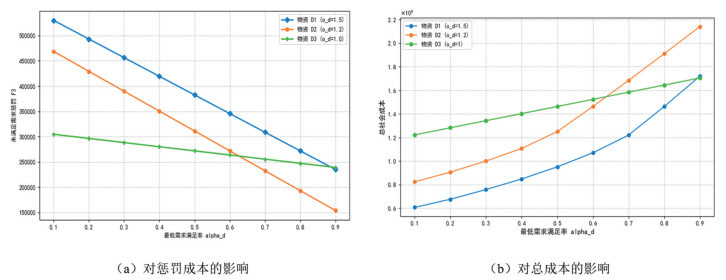 如图 4(a)所示,三类应急物资的惩罚成本随最低需求满足率提高而下降,其中医疗急救类物资因权重最高,其满足率下降对惩罚成本的影响最为显著。当物资最低满足率大于0.6时,生活救生类物资最低需求满足率对惩罚成本的影响超过应急食品类,说明在持续性强降雨和道路严重受损的情况下,生活类物资的缺货代价随灾情延续逐渐凸显。相反,如图 4(b)所示,从总成本角度看,随着最低需求满足率的增加,运输三类物资的社会成本均上升,其中生活救生类的边际效应最大,即其满足率每提升一个单位所增加的成本最高。这是因为,为提高物资送达率,需要动用更多的车辆和直升机进行运输,导致成本显著增加。因此,在洪涝灾害的应急物资调度中,需要在物资覆盖率与经济性之间加以权衡,以实现有限资源约束下的最优分配。