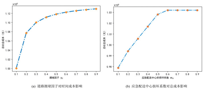 从图 6(a)可以看出,随着道路拥堵因子γij由0.1增加至0.9,总社会成本逐步上升,特别是在γij变动范围为0.1-0.4时,增长趋势最为显著。这说明,洪水泥淤积导致的道路阻塞在初期对运输效率影响突出,对成本的影响较为显著。当γij大于0.5时,总社会成本增幅趋于缓和,表明在灾情可控或资源配置较优的情境下,可通过优化应急机制提升效率。一旦洪水导致道路严重损毁,应急救援体系应优先启用直升机空运方式,由应急供应商直接将物资投送至受灾区域,以规避因道路中断和淤泥堆积造成的运输延误与损耗。
