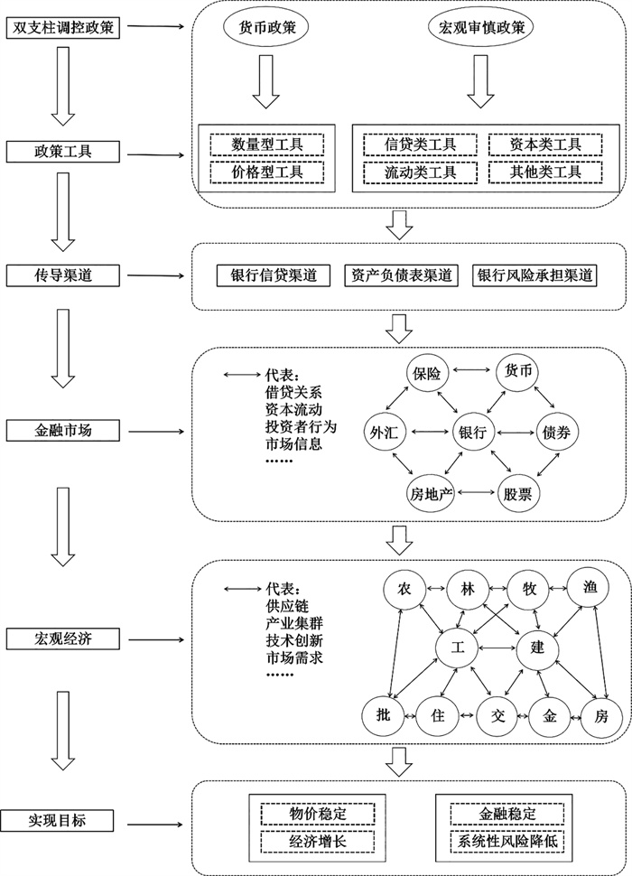 总体而言,货币政策与宏观审慎政策通过在目标上协调配合以及在渠道上共生传导,能够有效治理系统性风险与稳定经济增长。如图 1所示,双支柱调控政策效应通过银行信贷、银行风险承担、资产负债表等渠道,直接传导到银行、货币、债券、保险、股票、房地产等各金融子部门。金融市场各子部门之间由于借贷关系、资本流动、投资者行为、市场信息等因素所形成的高度网络关联性,会引起双支柱调控政策效应在金融市场迅速发酵并扩散,产生溢出效应。同时,金融市场与经济市场以及经济市场行为主体之间又息息相关,通过产出效应、价格效应以及金融加速器理论将政策效应传向经济市场,对经济市场中各行业也会产生政策效应,最终实现“稳增长”与“防风险”的双重政策目标。