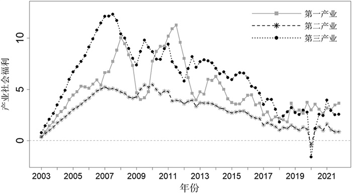 本研究依据国家统计局2018年修订的《三次产业划分规定》,将11个行业划分为三大产业。其中,农业、林业、畜牧业、渔业属于第一产业;工业、建筑业属于第二产业;批发和零售业、交通运输、仓储和邮政业、住宿和餐饮业、金融业以及房地产业属于第三产业。将每个产业所属行业的社会福利相加,来代表各产业的社会福利,图 10展示了各产业的社会福利情况。从图 10中可以发现:第一,三大产业的社会福利基本上都大于0,尤其是第一产业在所有时期的社会福利都大于0。这说明中国政府目前所实施的双支柱调控政策对各产业社会福利的增进是有益的。第二,在大部分时期,三个产业的社会福利从高到低依次为第三产业、第一产业、第二产业。这一现象反映了不同产业在社会福利分配方面的差异。第三产业通常包括服务行业和高附加值产业,其提供的工作机会更多且薪资水平相对较高,有助于提升整体社会福利水平。相比之下,第二产业往往受到国际市场波动和劳动力成本压力的影响,其社会福利水平可能相对较低。这种产业间社会福利水平的差异反映了产业结构对社会福利的影响,为政府制定相关政策和发展战略提供了重要参考依据。第三,除第一产业外,其他两个产业在新冠疫情时期的社会福利都出现了较大幅度的下降,且出现了负值。这可能是由于,第二产业包括建筑业和工业部门,受到了供应链中断、需求下降以及劳动力不足等问题的困扰,导致社会福利水平的下降;第三产业包括零售、住宿、餐饮等服务行业,直接受到旅行限制、社交距离以及封锁措施的冲击,因此也经历了显著的社会福利下降;第一产业主要包括农业、林业、渔业等农产品生产与自然资源开发领域的产业,食品和农产品被认为是基本的生活必需品,即使在新冠疫情期间,仍然需要保障供应并满足人们的基本需求,因而社会福利的下降趋势要小于第二、第三产业。