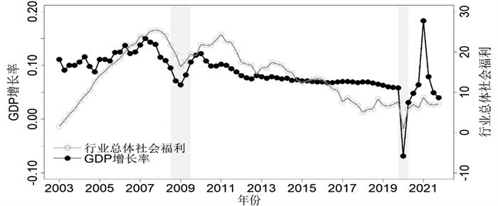 本研究将各实体行业的社会福利相加,来代表行业总体社会福利。图 11中报告了GDP增长率与行业总体社会福利之间的关系。由图 11可以得到:第一,中国实体行业总体社会福利始终大于0。这种持续的正值说明中国政府实施的双支柱调控政策对社会福利和实体经济存在着积极影响。第二,中国实体行业总体社会福利与GDP增长率趋势较为相似。这说明双支柱调控政策对GDP增长存在一定程度的影响,政策的调整可能会直接或间接地影响经济增长水平,导致两者之间趋势相近或相关。第三,在2008年金融危机和2020年新冠疫情期间,行业总体社会福利出现大幅下降,表明在尾部事件发生时期,中国实体行业总体社会福利也会受到影响,呈现下降趋势。