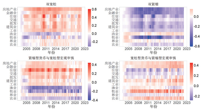 图 12展示了在四种不同的双支柱调控政策下,各实体行业的社会福利与基准社会福利(真实场景下的社会福利)之差的热图。其中,颜色越红代表在反事实情景下各行业的社会福利相对于基准社会福利越大,颜色越蓝代表在反事实情景下各行业的社会福利相对于基准社会福利越小。