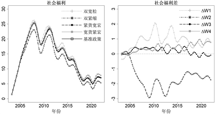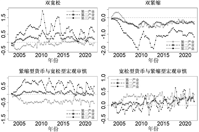 由上述分析可知:(1)对于第一产业而言,实施宽松型货币政策与紧缩型宏观审慎政策组合,有助于显著提高产业福利水平;(2)对于第二产业而言,除了紧缩型政策外,在其他三种政策情形下,均会提高产业社会福利水平,尤其是在双宽松政策下提高得更明显;(3)对于第三产业而言,实施双宽松和紧缩型货币政策与宽松型宏观审慎政策组合,均有助于提高产业社会福利水平。综上所述,不存在某种政策组合对三大产业的社会福利水平发展都是有利的情况,所以政府在制定政策时,需要综合考虑不同产业的特点和需求,制定有针对性的政策措施,实现产业间的社会福利均衡。