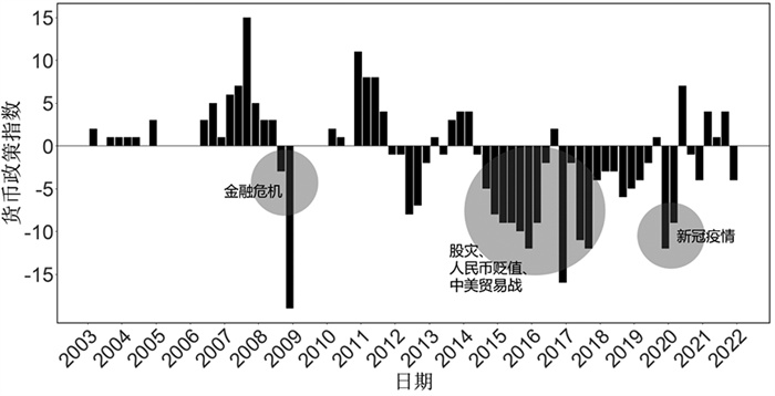 图 4报告了测度的中国MPI在2003Q1—2021Q4期间变化情况,其中,大于0表示采取了紧缩的货币政策,以应对经济过热或者通货膨胀;小于0代表实施了宽松的货币政策,以刺激经济增长或应对经济增长放缓的趋势。在2008Q2之前,中国MPI为正,其间中国处于经济过热时期,为了遏制通货膨胀,央行采取紧缩型的货币政策。2008年9月15日金融危机爆发后,央行于当年第三与第四季度采取了宽松的货币政策来应对经济下行风险,且在2008Q4货币政策的宽松程度达到了最大。2014—2018年间,在股灾、人民币贬值、中美贸易摩擦等一系列因素影响下,货币政策呈现一定程度的宽松,以支持国内经济平稳过渡。2019年底新冠疫情暴发后,MPI为负,这说明央行采取宽松的货币政策来对冲经济下滑风险。总体来说,本研究构建的MPI变动趋势与中国面临的国内外经济环境基本吻合。