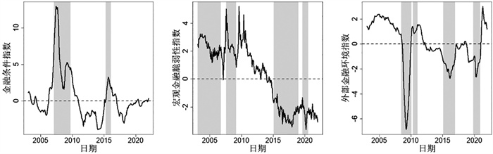 Prasad等根据宏观金融环境的不同特征,将其划分为三个分区:金融条件分区、宏观金融脆弱性分区、外部金融环境分区。[34]第一,金融条件分区旨在捕捉资产价格中隐含的风险价格、获得融资的难易程度、融资成本以及金融压力程度。第二,宏观金融脆弱性分区既要综合考虑杠杆率、流动性、偿债和负债能力等多方面因素,也要能捕捉家庭、企业、政府等各宏观部门的资产负债表失衡。第三,外部金融环境分区主要反映国外金融环境对国内经济增长的影响。