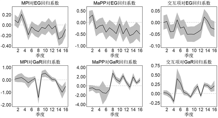 为探究双支柱调控政策如何影响实体经济增长,并考察其跨期替代效应,本研究采用面板数据分位数回归方法,结合宏观金融环境指数、MPI和MaPP,对中国11个主要实体行业在未来1至16个季度的EG和GaR进行预测。图 7展示了这些预测模型的回归系数,揭示了双支柱调控政策在施行一段时间后,对实体经济增长具有显著影响,并且这种影响呈现出两方面特点。第一,双支柱调控政策对GaR的影响大于对EG的影响。图 7显示,无论是MPI还是MaPP,二者对GaR的回归系数远大于其对EG的回归系数。这表明, 中国政府在实施双支柱调控政策时,不仅仅考虑对实体经济期望增长的影响,更加侧重于对实体经济下行风险的治理。第二,双支柱调控政策对未来经济增长的影响具有跨期替代效应。图 7显示,随着预测期限的延长,双支柱调控政策对EG和GaR的影响均呈现反向变动,即回归系数既有正值也有负值。这表明双支柱调控政策的实施,在短期内可能会促进经济增长,但从中长期来看,可能会造成风险的积累,引起经济下行。