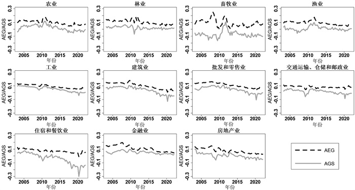 图 8报告了各实体行业在未来1至16个季度的EG和GS均值。从图 8中可以看出:第一,AEG与AGS呈正相关,即当AEG较大的时候,AGS值也较大。这说明实体行业的期望值增长越高,其面临的下行风险也越大,即“高增长高风险”。第二,AEG和AGS的波动趋势较为一致,但AGS的波动幅度明显更大。这一研究结果与Adrian等的研究发现相吻合,[10][17]说明宏观金融环境以及双支柱调控政策对实体经济的下行风险影响更大。第三,危机期间AEG和AGS均表现出明显的下降趋势。例如,在2008Q1—2008Q4金融危机期间,金融业和房地产业的AEG和AGS都有所下降;在2020Q1—2020Q4新冠疫情期间,工业、建筑业、批发和零售业等大多数行业都呈现了一定幅度的下降,尤其是住宿和餐饮业,下降幅度最大,说明该行业受新冠疫情的影响最大。