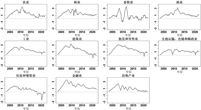 图 9展示了中国各实体行业在2003Q1—2021Q4期间的社会福利时序图。从图 9中可以看出:第一,中国各实体行业的社会福利在大多数时期为正值,说明中国政府所采取的双支柱调控政策促进了实体行业的发展。第二,部分行业在某些时期出现了负值的社会福利。例如,畜牧业分别在2009—2010年、2013—2014年、2017—2018年出现了负值,这可能是由于其间政府实施了一系列强监督措施(2008年三聚氰胺风波后的奶价干预、2013年奶源地价干预、2016—2017年奶价上涨干预等);住宿和餐饮业自2017年开始出现了较多期负值,这可能是由于自2017年以来,中国政府在经济调控方面的重点逐渐转向去杠杆化、防范金融风险等方面。在该背景下,政府对住宿和餐饮业等传统实体行业的政策支持相对减少,在社会福利的分配上更加注重高技术、高附加值行业,而对传统行业支持力度减弱。第三,相较于其他行业,金融业的社会福利一直位于较高水平。这可能是因为金融作为现代经济的核心之一,对整个实体经济的运行至关重要,所以政府在制定政策时给予金融业更多的关注和支持,从而使该行业的社会福利水平较高。第四,新冠疫情对社会福利产生了较大的影响。建筑业、批发与零售业、住宿和餐饮业以及房地产业在2020Q1的社会福利都为负值。这主要因为新冠疫情期间因需求锐减,建筑业和房地产业的投资下降,批发与零售业销售下降,住宿和餐饮业因交通管制和消费减少也遭受重创。尽管政府采取了一些支持措施,但新冠疫情严重程度可能超出政策覆盖范围,这些行业的社会福利也出现了负值。