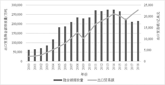 图 1 2000—2018年中国出口贸易隐含碳排放情况 |