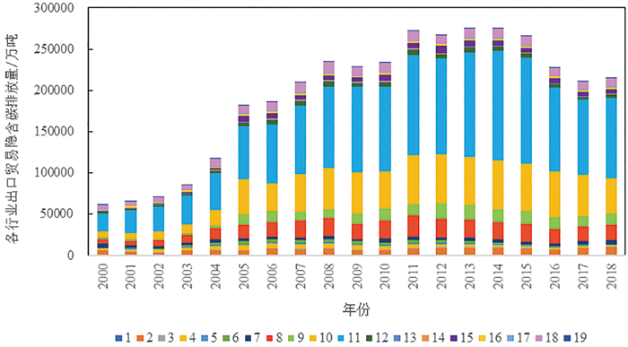 图 2 2000—2018年中国各行业部门的出口贸易隐含碳排放情况 |