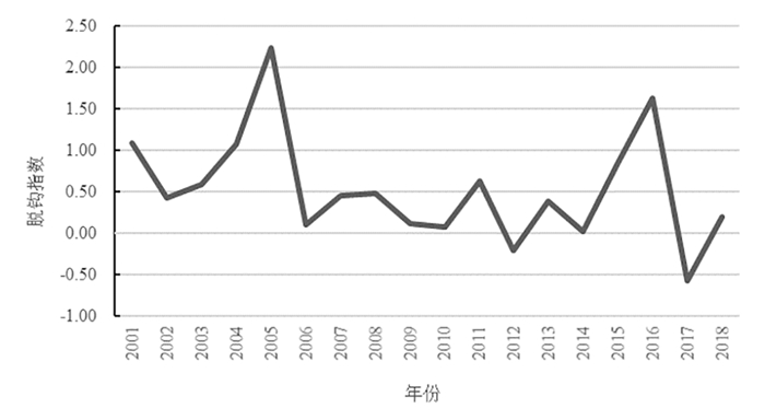 根据出口贸易隐含碳脱钩模型计算公式和脱钩类型划分标准,得到中国出口贸易与其隐含碳排放脱钩关系(表 6)。结合图 3可以看出,2000—2018年中国出口贸易隐含碳脱钩指数在-0.6~2.3之间波动。尽管中国出口额总体上呈现增长趋势,但隐含碳排放量在个别年份出现下降或停滞,脱钩指数呈波动发展趋势,出口贸易隐含碳排放脱钩进程呈现明显的阶段性特征。