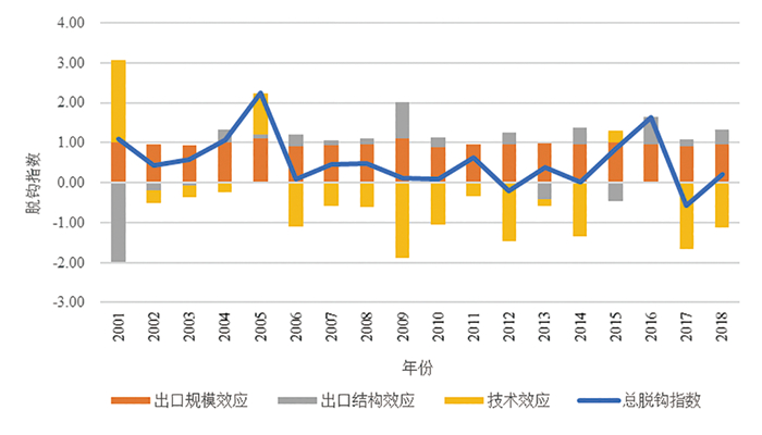 图 4 2000—2018年中国出口贸易隐含碳脱钩效应驱动因素分解 |