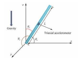Fig. 2 Working principle of the single accelerometer-array segment. The spatial attitude of one accelerometer-array segment (blue bar) is determined by the triaxial accelerometer, and deformation was calculated using the change in spatial attitude (Wang et al., 2018b). |