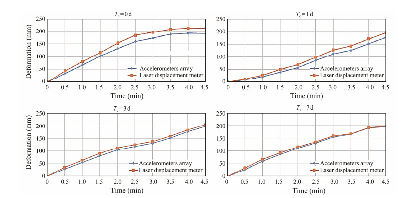 When the lateral deformation of soils in the upper chamber occurred, the accelerometer-array inside the soil would deform therewith. Unlike the monitoring in steel, concrete or composite structures, the accelerometer-array in the earth structures cannot be adhered directly to soils; hence, the intimate contact between the accelerometer-array and the surrounding soil mass can hardly be ensured (Zhang et al., 2016a). Whether the accelerometer-array coupled with soils perfectly during deformation is one of the questions that the tests intend to solve. The collected lateral displacement data of Joint A were compared with the data of the laser displacement meter, and the time series of deformation data are shown in Fig.4. The results show that the deformation trend of the accelerometer-array and soil are in good agreement during the test process.