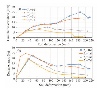 The ratio of accumulative deviation to soil lateral deformation was taken as the deviation ratio (Fig.5b). The test results revealed that the deviation ratios were large in the initial stage of the soil deformation. For the deformation in the range of 0 – 50 mm, the deviation ratios were as high as 19.2% – 24.4%, even in Test 4 when the soil was consolidated for 7 days. While the coupling deviation tended to be decreasing and kept stable when the deformation was larger than 100 mm, with the deviation ratios between 0.7% – 13.7%.