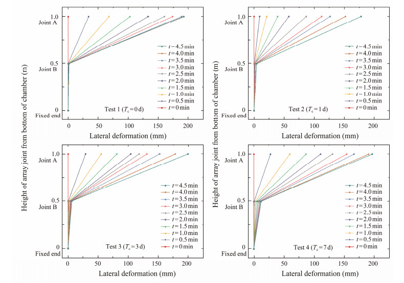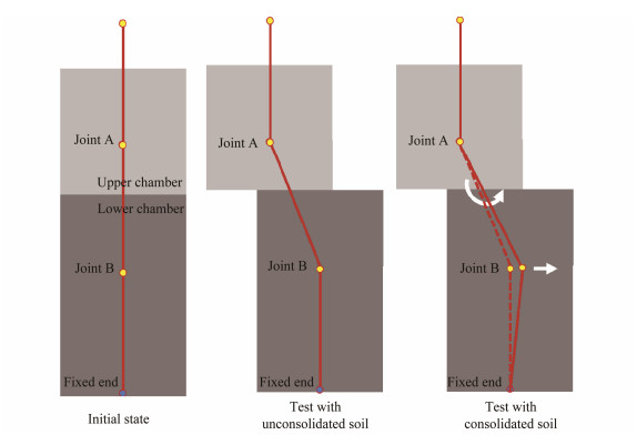 The end of the accelerometer-array was fixed with the bottom of the simulation test chamber through a fixing ring, and the accelerometer-array was kept vertical before the test startup to ensure that the initial conditions about accelerometer-array of all tests were the same. Two Joints (A, B) of the accelerometer-array were located in the test chamber to provide the deformation data during the test. The collected deformation data at Joint A is aimed at testing the coupling effect between the accelerometer-array and soil, and the data at Joint B is aimed at testing the linkage effect of the accelerometer-array. During the test, the data acquisition interval is 0.5 min.
