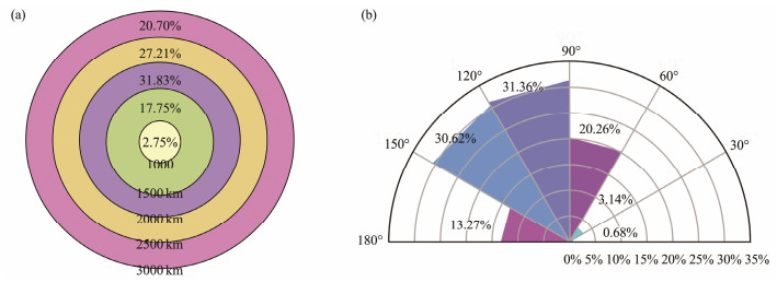 Fig. 6 (a) Proportion of TRP within each radius from the TC center; (b) proportion of angles between the line connecting the TC center and TRP station and the east direction during 1979 – 2020. |