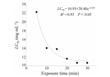 3 Results 3.1 Acute Toxicity and Toxicity CurvesBased on the probit-regression analysis of log-dose and mortality data at exposure times of 6, 12, 16, 24, and 30 min, the LC50 values were calculated and are shown in Fig. 1. The LC50 values decreased with increasing duration of exposure. The regression analysis demonstrated that the toxicity curve significantly fitted to the following equation: