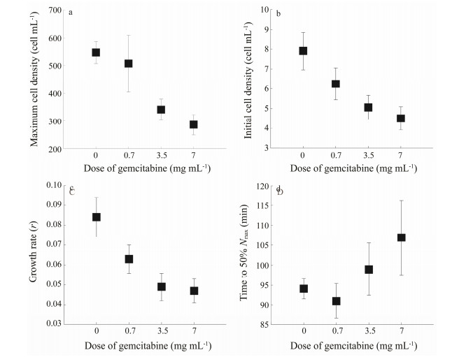 Fig. 3 Effects of gemcitabine on the maximum cell density (a), initial cell density (b), growth rate (c), and the time to 50% maximum cell density (d) of Eulpotes vannus. |