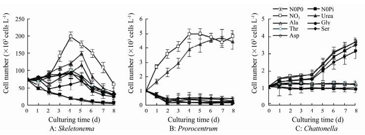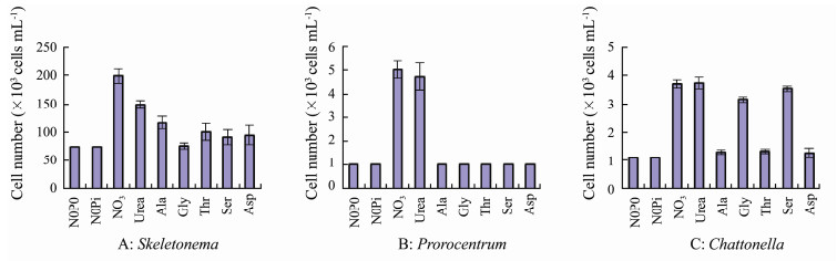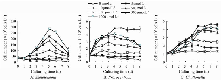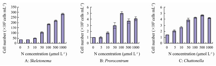 Growth of C. marina was observed under nitrate concentrations of 5-1000 μmol L-1 (Figs. 1C, 2C), and cell numbers in these treatments were significantly higher than that in N-free control (P < 0.01). The maximum yields increased with increasing concentration of NO3-N to 500 μmol L-1, which was 4.64×103 cells mL-1 (Fig. 2C).