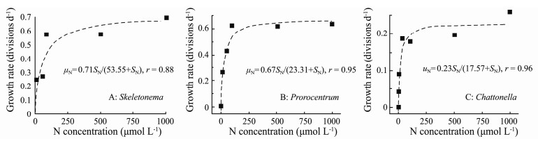 The relationships between specific growth rates (μ) of the three microalgae and the concentrations of NO3-N were determined using the Monod equation (Fig. 3). From the equations, the values of μmax and Ks for NaNO3 were 0.71 divisions d-1 and 53.55 μmol L-1 for S. costatum (r = 0.88), 0.67 divisions d-1 and 23.31 μmol L-1 for P. micans (r = 0.95), and 0.23 divisions d-1 and 17.57 μmol L-1 for C. marina (r = 0.96), respectively.