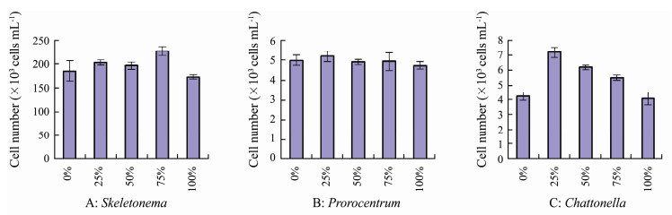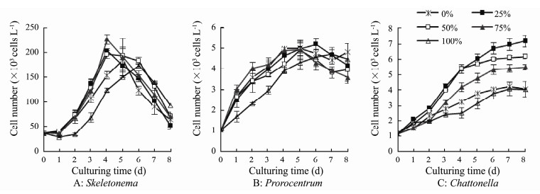 2 Materials and Methods 2.1 Algal CulturesUni-algal cultures of S. costatum, P. micans, and C. marina were isolated from Daya Bay, China. The stock cultures were maintained in autoclaved (121℃, 20 min) f/2 media (Guillard, 1975) at 20℃ ± 1℃ and salinity 30 and under 100 μmol photon m-2 s-1 of cool-white fluorescent illumination with a dark: light cycle of 12 h: 12 h. The cultures were treated with mixture antibiotics to destroy the external bacteria before the experiment. Firstly, 10 μg mL-1 penicillin (final concentration) was added in 100 mL cultures in exponential phase, and incubated for 24 h, then 10 mL of the penicillin-treated culture was inoculated to the fresh f/2 medium with 10 μg mL-1 streptomycin sulphate, and incubated for another 24 h, and followed by the treatment of 10 μg mL-1 kanamycin sulfate. The multi-antibiotics treated algal cultures were maintained in the sterile f/2 medium. Before the experiments, the cultures were transferred to the modified f/2 medium, which contained 100 μmol N L-1 (NaNO3), 7 μmol P L-1 (KH2PO4) and 70 μmol Si L-1 (Na2SiO3), approximating the maximum nutrient concentrations found in Daya Bay (Wang et al., 2009). Clones were maintained in the exponential growth phase by serial transfer in the modified f/2 medium. The cells for inoculation were pre-incubated for two days in the N-free medium.